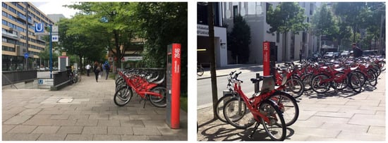 Regarding service, the main focuses include cleaning of cycling paths and winter surface clearance, planning and implementing B + R facilities, and developing the public bicycle hiring system. Surface clearance is particularly important in autumn and winter to ensure the safety and usability of cycling paths. In recent years, Hamburg has introduced high-quality B + R facilities, which include two-story parking racks, parking boxes with locks, and storage boxes for cyclists’ equipment (Figure 1). The city plans to deploy about 28,000 B + R parking places by 2025 [51,57]. For long-distance railway stations, there will be an increased number of cycle stations and enclosed parking garages. The public bicycle hiring system of Hamburg, StadtRAD (Figure 2) was established in 2009. In 2016, there were about 2500 bicycles at 206 docking stations, with over 402,000 users [56]. Now it is one of the most successful bicycle hiring systems in Germany and Europe [56].