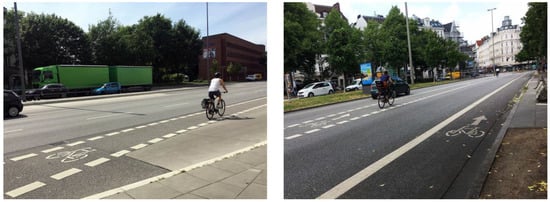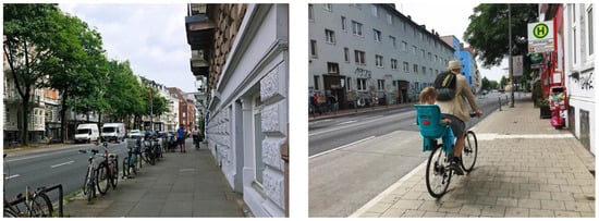 Cycling-oriented urban design could also help overcome people’s reluctance to use on-road cycling lanes by enhancing the visibility of cycling infrastructure to increase perceived safety [62,64,65]. From a cyclist’s perspective, the same cycling infrastructure is not suitable for cyclists with a different level of skills [62]. In Hamburg, the street space might not be enough to add green belts protection for on-street cycling lanes. However, some informal separation could be added, for example, using a small strip of cobbles to separate the motorized traffic lanes [65] and coloring of the on-street cycling lanes to form a distinct demarcation [62]. These types of separation should also be complemented by a reduction of motor traffic speed, which could increase people’s reaction time and increase perceived safety [66].