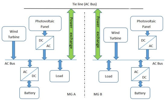 The particular configuration of the proposed two micro-grids system, using PV panels, wind turbines, battery storage, is shown in Figure 2 (MG A and MG B represent micro-grid A and micro-grid B). Tie line is constructed between the interconnected micro-grids to realize power exchange and storage of surplus electricity generated by renewable energy. On one hand, tie line makes the interconnected micro-grids a backup for each other. When the renewable energy generation and battery storage system in one micro-grid are not sufficient to supply the load, the surplus power and stored energy of the interconnected micro-grid can be used to cover the power gap, thus, reducing the system power installed capacity and improving the reliability of power consumption. On the other hand, when the electricity generated by renewable energy in the micro-grid exceeds the load, the excess power is firstly stored in its own battery storage system. If its own battery storage is full, the remaining power will be transferred to the adjacent interconnected micro-grid to store, improving the use efficiency of renewable energy generation. In addition, some wind turbines will stop working to avoid generation of surplus power when both storage batteries are full.