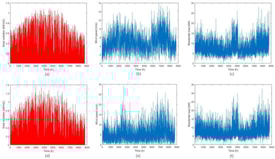 The input data for every hour of a year in Yinchuan. (a–c) shows the input data for MG A and (d–f) for MG B.