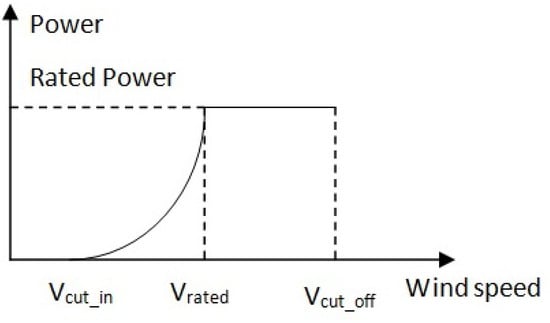 A simple model that describes the power generation of a wind turbine is shown in Figure 4. is the cut-in speed which starts generating power. When wind speeds get higher, the output power increases until reaching a point of maximum yield at (rated speed). Finally, When the wind speeds reach above (cut-off speed), the wind generator simply stops its operation to protect its mechanism.