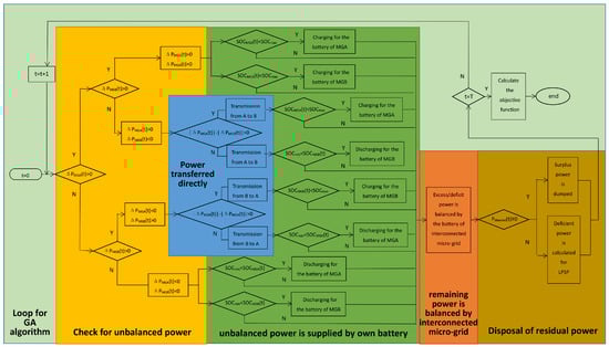 The flow diagram of the proposed collaborative operation strategy for the two micro-grids system is shown in Figure 5. Where stands for the remaining power which is after balanced by the battery of interconnected micro-grid. T represents the maximum iteration number of the algorithm.