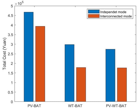 Table 3 shows the total optimal amounts of renewable energy generations, batteries and the capacity of tie line for each micro-grid under independent mode and under interconnected mode. Figure 6 shows the total cost comparison of two micro-grids with optimal capacity under independent mode and under interconnected mode.