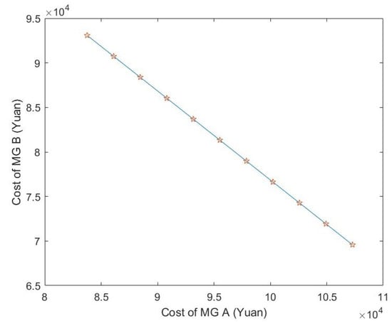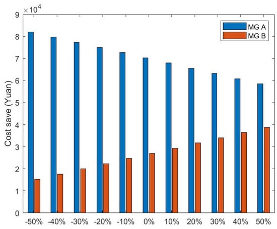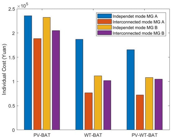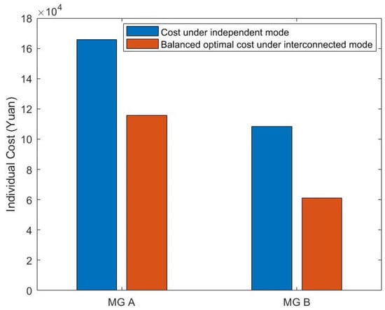 According to the simulation results, when the power transaction price takes 4.5 Yuan/kWh, the cost savings of both MG A and MG B are relatively large, and both of the interconnected micro-grids have a strong willingness to adopt interconnection. Compared with the cost of independent sizing mode, the cost of MG A is 115,770.86 Yuan, reduced by 30.2%, and the cost of MG B is 61,066.88 Yuan, reduced by 43.65%, which is shown in Figure 15.