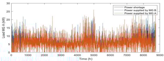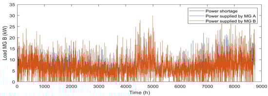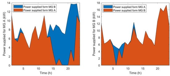 In order to further describe the collaborative operation of the interconnected micro-grids, a typical day is selected in the area where the power exchange is frequent to analyze the power supply of the MG A and the MG B, as shown in Figure 12. From the figure, it can be seen that on the typical day from 2:00 to 5:00 and from 15:00 to 24:00, the MG B has enough energy to generate power, thus has sufficient power to provide support for MG A. During the period of 3:00 to 9:00 and from 10:00 to 13:00, the power generation of MG B is relatively weak, so that MG A provides an effective power supply to MG B to meet its load demand.