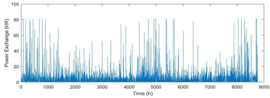 From Figure 8 and Figure 9, we can see that the interconnection between the two micro-grids contributes effectively to supporting residential load in each micro-grid, which ensures the reliability for power supply. In addition, Figure 10 shows that when the load is in the peak period of power consumption of a year, such as winter or summer, the power exchange between interconnected micro-grids is the most frequent. The main reason is that the interconnected mode makes positive energy exchange between interconnected micro-grids, thus ensuring reliable power consumption for users with less installed power capacity. During the simulation period, The total power transferred form MG A to MG B for one year is 11,055.72 kWh, which is 16.77% of load for MGB. The total power transferred form MG B to MG A for one year is 20,777.03 kWh, which is 31.56% of load for MG A. The comparison of the installed capacity for PV-WT-BAT under two modes shows a reduction trend in the necessary installed capacity of the photovoltaic panels and batteries. The total power exchange between MG A and MG B is shown by Table 5.