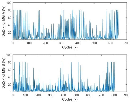 The power exchange between the interconnected micro-grids can be seen from Table 5. The power transmitted from MG B to MG A is more than that from MG A to MG B, which is mainly due to the abundant wind resources in the B area. Unlike the independent mode, the unbalanced power generated by the MG A and MG B at time t is not stored in its own energy storage system, but is firstly consumed directly according to the load of the interconnected micro-grid at the same moment. Due to the interconnection mode, micro-grids can make full use of regional tie line to deliver unbalanced power directly. The depth of discharge (DoD) of MG A and MG B calculated by Rain Flow algorithm are shown in Figure 11. The lifetime calculated according to the dispatch in the collaborative operation for batteries of MG A and MG B are 7.5 years and 8.17 years respectively. In addition, when there is surplus of power or power shortage at either side of the interconnected micro-grids, the unbalanced power can be maximally stored or supplied according to the different states of the terminal’s storage batteries, which improves the reliability of micro-grids system under interconnected mode.