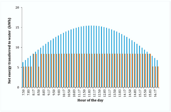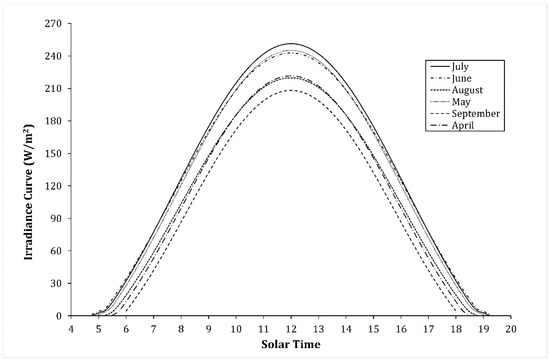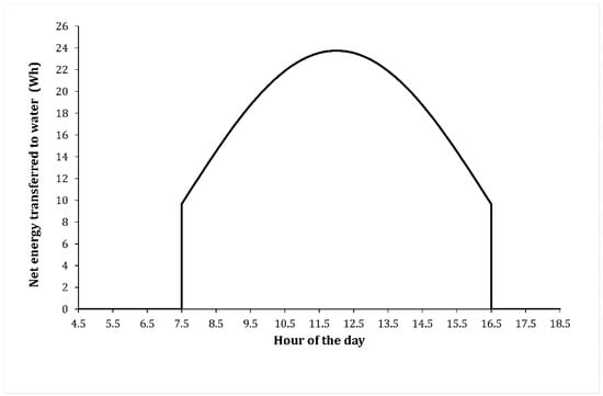 The monthly irradiation curves for the Albamix network are shown in Figure 1. These values were obtained with the formulas described in Appendix A. As 9 h is considered to be the time profitable for converting solar energy into shaft work in pumps, the net energy transferred to the water considers the nine hours of higher irradiance for a single PV panel (from 7.5 to 16.5 h; Figure 4).