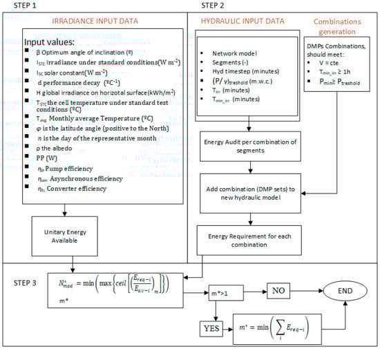 - For the m combination, and at every i time step, the number of solar panels is calculated as:where is the i-th value for the unitary energy available (calculated in Step 1) and is the i-th value for the energy available (calculated in Step 2). The quotient represents the number of solar panels to satisfy the i-th water demand (“ceil” being the ceiling function that takes as input a real number X and gives as output the nearest integer greater than or equal X). The maximum of these i values results in the number of solar panels required for the m combination. Finally, a row vector of size (1, m) is obtained (one for each m combination) and the minimum of these figures should be the number of the modulus () obtained at the m* combination.
