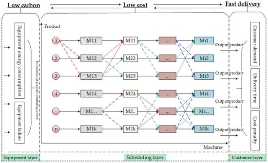 - Green and sustainable development aspects: Low carbon is an important indicator of green development, Ding et al. [9] considered a permutation flow-shop scheduling problem with the objectives of minimizing the total carbon emissions and makespan. Liu [10] presented a job-shop scheduling model and established a carbon footprint model to quantify the carbon emission of different scheduling plans, in which three carbon efficiency indicators were put forward to estimate the carbon emission of jobs and equipment. Yin et al. [11] proposed a low-carbon mathematical scheduling model to optimize productivity, energy efficiency, and noise reduction. Liu [12] developed an ε-archived genetic algorithm to examine two-batch scheduling problems to minimize CO2 emission and total weighted tardiness.