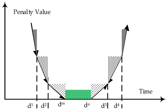 In addition, customer’s demand can be represented by the time window . When the completion time falls into the time window, the assembly task is completed according to the customer’s requirements. When the completion time deviates from the time window, it means that the customer’s demand cannot be met. The penalty diagram of the time window constraint is shown in Figure 2 (, , , represents penalty threshold of time windows).