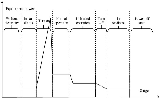 Under normal circumstances, equipment with different gears can be divided into the power-off phase, the standby phase, the equipment start-up phase, the low-speed operation phase, the no-load operation phase, the mid-range operation phase, the high-speed operation phase, and the equipment shutdown phase. The equipment power under different stages is shown in Figure 3.