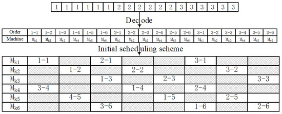 The two-layer coding is carried out in the form of a real number system. The encoding and decoding of chromosomes are shown in Figure 5 during production scheduling.