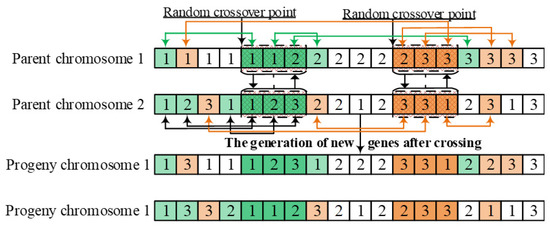 In Equation (30), and are random variables within to control the cross population. represents the individual fitness value of the current population, represents the maximum fitness value of the individual function in the current population, and represents the average fitness value of the individual in the current population. According to the crossover probability, chromosome crossover was determined. In this paper, a two-point crossover was adopted, that is, two points were randomly selected in the parent chromosome as the crossover region. After two chromosomes were crossed, invalid coding was performed to eliminate the invalid coding, so as to ensure the feasibility of population scheme. The cross operation is shown Figure 6.