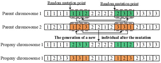 In Equation (31), is a random variable within to control the mutant population. represents the individual fitness value of the current population, represents the maximum fitness value of the individual function in the current population, and represents the average fitness value of the individual in the current population. According to the crossover probability, the chromosome was determined for the mutation operation. In this paper, the two-point crossover method was adopted, that is, two points were randomly selected from the parent chromosome as the mutation region for gene exchange. The variation operation diagram is shown in Figure 7.