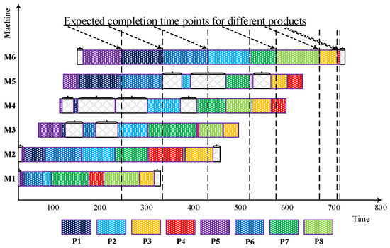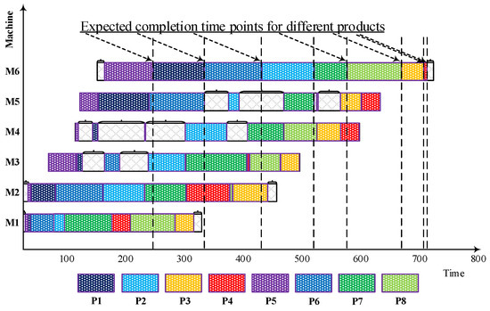 Table 6 and Table 7 show that the model designed and the improved algorithm have certain advantages in controlling cost, carbon emission, and delivery time in this paper. The Gantt chart of production scheduling optimization solved by using the genetic algorithm (GA) is shown in the Figure 12.