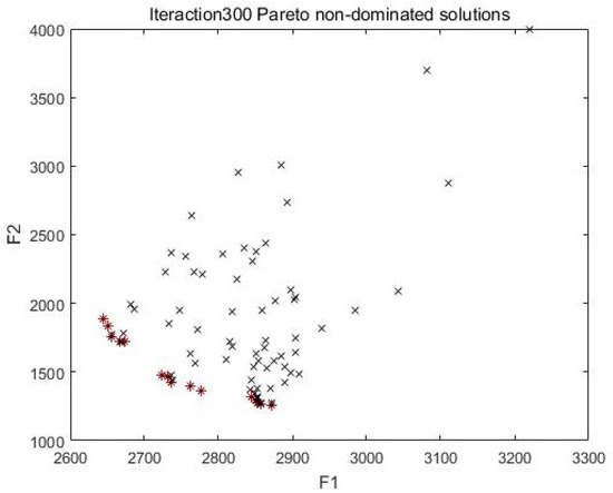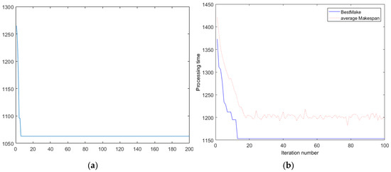 In order to further verify the effectiveness of the algorithm designed in this paper, the number of iterations was set to 200 times, and its iterative optimization diagram is shown in Figure 9. The (a) in Figure 9 shows the optimal solution under 200 iterations, and the (b) in Figure 9 shows the optimal solution and average solution under 100 iterations. According to Figure 9, the improved GA can satisfactorily satisfy the solution of the model, and can quickly converge to minimize the optimal value 1063 of the average value of the multiple objective.