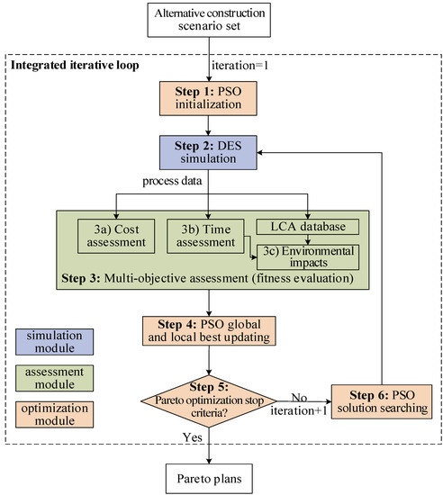 The simulated process data from DES, including the simulated working productivity, working time and idle time of each equipment and crew, and materials consumption provides detailed data for environment–cost–time performance assessment (see Figure 3). Firstly, the construction processes are simulated by the DES model. The impact sources, such as the materials used, equipment, and labour are obtained. The time performance is directly simulated, and the impacts and cost are assessed with impact sources. The results work as fitness for multi-objective optimisation, by which the PSO can perform information updating (step 4), and further Pareto solution searching.