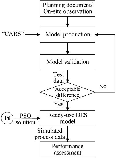 In the integrated framework, the DES is designed for a construction scenario simulation. The solutions that are represented by PSO particles are automatically input in the simulation model as parameters. After the simulation, it provides construction-process data for impacts assessment, cost estimation and directly duration simulation. The steps involved in the DES construction simulation are shown in Figure 2. Firstly, the construction DES model need to be developed. The construction planning documents and on-site observation are valuable information for model production. A construction conceptual model referred to as the Activity-Component-Resource-Action-Sequence (CARS), originally proposed by Fischer et al. [44], is used to collects the decentralised construction-related information into a unity model. It concepts the construction operation as four aspects, which are the constructed component, the required resource (materials, labour, and equipment), and series of required actions to construct the component, and the inherent work sequence, such as work predecessor and successor. Thus, the DES-based construction model can be developed with systematic information.