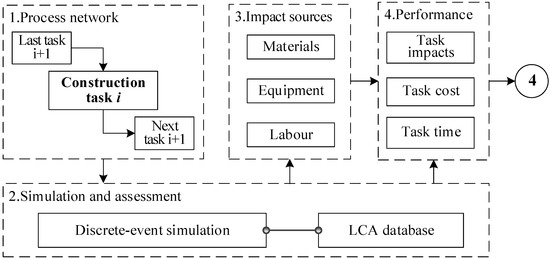 With the increase of height of task location, the vertical transportation equipment, like the tower crane and construction lift will use more time and higher electricity usage to complete a unit construction task. At the same time, both the crew transportation and concrete pumping’s energy consumption will also change [60]. It requires moment analysis during the construction process. By DES model in the proposed integrated method, it provides a momentary simulation ability to assess the accumulated project time, cost, and environmental impacts.