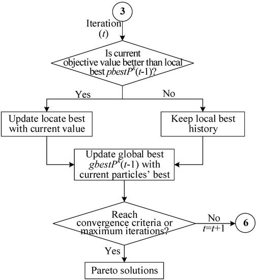The particle of PSO moves to the optimal position alongside a trajectory that calculates the relation between the present position and their own previous best position (local best), as well as the best position of the swarm (global best) [33]. Therefore, it achieves a balance of exploration and exploitation by combining local and global searching [53]. Using the results of fitness evaluation (step 3), the local and global best positions are updated as Figure 4. Each particle has a list of its best position history, which is updated if the present position is better than previous best history; otherwise, it will be kept. In the same way, the global best position will be updated by present particle swarm. These global/local best information updates are the basis of further solution searching.