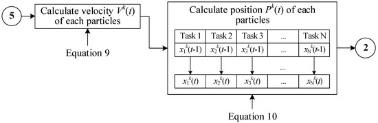 The particle of PSO will search new solutions by the movement of particle positions (P), as described by Equations (9) and (10) when stop criteria are not reached. As shown in Figure 5, based on the velocity updating mechanism (Equation (9)), the new velocities Vk(t) for each particle are calculated. Then, the position (plan) of each particle are calculated based on new velocity and their previous positions (Equation (10)). In this way, the searched new construction plans changes xn for each task n, in order to (1) move to other particles that have optimal performances, and; (2) to learn from their own optimal performance history. And these new construction plans will return to be simulated by DES (step 2) for further iteration.