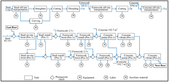 The construction of the frame structure for the standard floors started from 15 June 2014 and ended on 15 September 2014. The regular on-site working schedule was from 7:00 a.m. to 17:00 p.m., with a 2-h lunch break. Through on-site observations, the actual construction tasks and process logic of the frame structure thereof were surveyed (shown in Table 1 and Figure 6). The on-site space was divided into two sections. A flow construction process was performed on these two working spaces by each task team in sequence. In this construction method, each construction activity was influenced by the factors of prerequisite work, equipment, materials, labour resources, and working space. Thus, the real-time schedule of an activity will influence their succeeding tasks, and thus affect the entire project duration. The idle time due to prerequisite work being incomplete, unavailable resources, and unreached working space will also affect the total equipment rent cost.