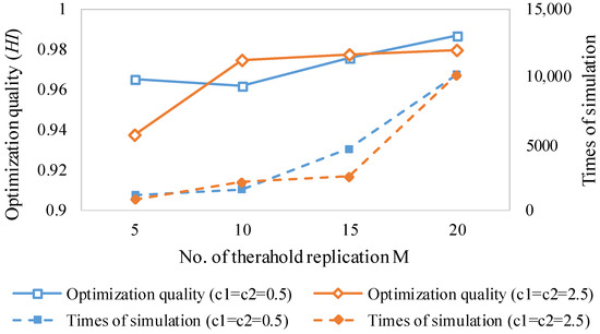 The proper parameters in PSO need to be selected to achieve a best optimisation, considering efficient computing loads. The inertia weight w is set as a dynamic value. Acceleration coefficients c1, c2, and the stop replication below the optimisation threshold M remain crucial parameters for PSO-based optimisation. As the optimisation quality for multi-dimension problems is not easily visualised, a popularly used indictor (hypervolume indictor) proposed by Zitzler et al. [69] is used to evaluate the quality of different Pareto fronts (see Figure 7, HI = H/(L1 × L2)). A sensitivity analysis was conducted to choose proper parameters, taking the balance of optimisation quality and computing loads (see Figure 8). Results show the optimisation quality receives an improvement when M increases from 5 to 20, and the acceleration coefficients c1 = c2 = 2.5 are better than c1 = c2 = 0.5 when M is higher than 10. Therefore, the c1 = c2 = 2.5 was chosen for this case. On the other hand, the optimisation improvement was less clear cut when M was over 10 for c1 = c2 = 2.5. Besides, the required simulation increases sharply when M reaches 20. Thus, replication M was set as 15, considering both the optimisation quality and the computing loads.
