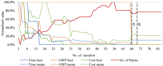 After the above preparation, the simulation-based optimisation algorithms (see Algorithm 1) were performed, and DES-based simulation and assessment were called at each step of particle fitness evaluation. The iteration stop criteria was reached at the 83th iteration (see Figure 9), and CPU (2.8 GHz, 4 cores) running time was 24,989 (s). At each iteration of integrated optimisation, the fitness of the global best particle, the swarm’s average values on three objectives, and searched the number of Pareto solutions were recorded, as in Figure 9. It shows that the global best values on construction cost, duration, and environmental impacts had a sustained reduction before the 65th iteration. However, the swarm’s average values on three objectives represented a trade-off relation on the objectives before the 68th iteration. The number of Pareto solutions show an increase tendency with fluctuation before the 68th iteration. After the 68th iteration, the average values on the objectives and the number of Pareto solutions became steady.
