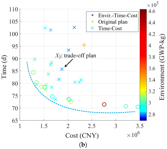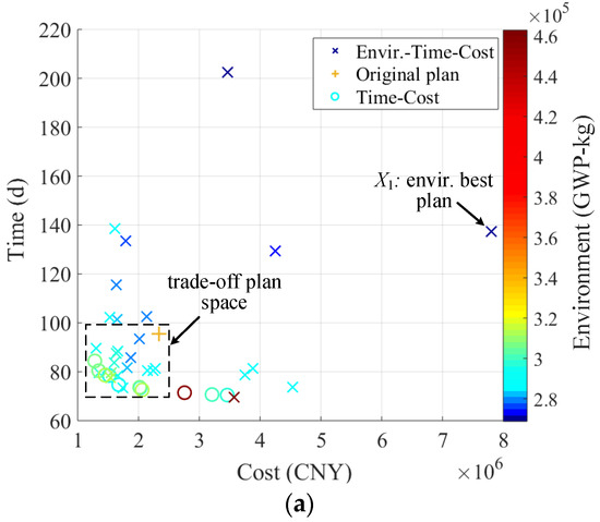 For this case study, a total of 28 Pareto construction scenarios were obtained by the proposed method (see Figure 10). Compared with the simulation of the original plan (GWP: 383,414-kg, cost: 2,336,300 CNY, time: 95.46 d), they at most lead to reductions of (383,414 − 268,788)/383,414 = 29.9% on the environmental impact, (2,336,300 − 1,306,245)/2,336,300 = 44.1% on construction cost, and (95.46 − 69.68)/95.46 = 27.0% on project duration, respectively, when choosing the single objective best solution. X1 = {(1,4) (2,1) (3,3) (4,70) (5,3) (6,1) (7,22) (8,2) (9,1) (10,8.67)} is the environment best plan in environment-cost-time Pareto solutions (see Figure 10a). While X2 = {(1,4) (2,4) (3,2) (4,66) (5,2) (6,1) (7,51) (8,2) (9,1) (10,8.00)} is a three objective trade-off plan, which improves the environment with non-worse times and cost performances, compared with the original plan (see Figure 10b). If the cost increase of the environment best plan X1 (7,808,526 − 2,336,300)/2,336,300 = 234.2% is not acceptable for contractors, there still are 15 trade-off plans in Pareto solutions having lower environmental impacts without sacrificing cost and duration. For instance, the plan X2 reduces (383,414 − 280,201)/383,414 = 26.9% of GWP impacts, (2,336,300 − 1,875,089)/2,336,300 = 19.7% of project cost, and (95.46 − 85.69)/95.46 = 10.2% of duration.