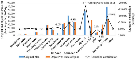 To analyse the reason of impact reduction in detail, the objectives trade-off solution, X2 and original construction plan are compared by impact sources as Figure 11. A value of 280,201 kg GWP is obtained by trade-off plan within Pareto solutions using X2. Compared with original construction plan, overall 26.9% of GWP impacts can be reduced by X2 using integrated method. In all of impact reduction, the total impact reduction contribution by sustainable material selection is 18.2% because of using SFS (steel formwork system) and annealed iron wire. As construction equipment, new type of mixer truck contributes 4.4% of GWP reduction, and the crane tower contributes 1.0%. According to the results of a case study, the iron wire and plywood are the two major contributors in terms of GWP impact as auxiliary materials. The concrete mixer truck, steel transport trailer, and the construction lift contribute the three major parts of GWP impact as equipment (see Figure 11). These results are consistent with previous studies by Feng et al. [40] and Bilec et al. [4], which demonstrated that construction-related iron wire, plywood, and transportation are the major sources of GWP impact.