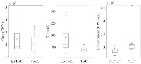 Pareto multi-objective comparison between environment–time–cost (E.–TC.) and time–cost (T.–C.) optimisation (red diamond indicates average value).