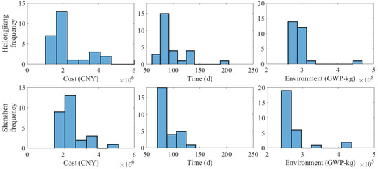 A comparison study was conducted to compare optimisation results of original construction location (Heilongjiang, North China) with an assumed location (Shenzhen, South China). The local price level and energy emission factors are different between two regions. The local cost for construction is based on Construction Engineering Quota (CEQ) of Heilongjiang [60] and Shenzhen [70], while the construction energy emissions are based on NDRC [63] of these two regions. A total of 28 Pareto plans are obtained when case building was constructed in Shenzhen. Performances are compared between these two locations with frequency distribution (see Figure 13). The final Pareto solutions of Shenzhen in average have higher construction costs than Heilongjiang, while the environmental impact is lower than Heilongjiang. According to CEQ of Heilongjiang and Shenzhen, the construction cost is higher at Shenzhen (South China) than Heilongjiang (North China), but the CO2 equivalents of electricity supply are lower in the south of China [63]. The Pareto solutions obtained by integrated method conform to these (see Figure 13).