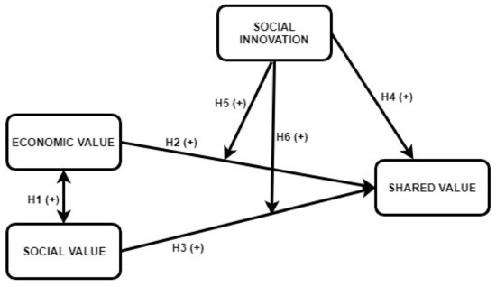 In this work, we seek to examine one of the models addressing critical societal ills facing communities and the world at large. According to [2], shared value in education is explained as a process where enterprises enhance educational and career outcomes while improving shared value outcomes. It is an innovative and sustainable business concept that integrates several business models and focuses on how profit-oriented enterprises can generate revenues and simultaneously tackle societal problems. It can also provide a novel way of helping to tackle global educational defects by companies without endangering their profits [2]. Creation of shared value (CSV) consists of two forms—social and economic values—which conflate to generate sustainable and substantial value for business and society [10,15]. CSV is made up of three pillars: reconceiving product and market, redefining productivity in the value chain, and supporting cluster development [10]. Since the inception of CSV, many multilateral companies, such as Nestle, Novo Nordisk and Google, have adopt edit and achieved successes. The concept of CSV is studied in many areas, such as the hotel industry [18] and water sector [19] but, a thorough review of literature in respect of the concept reveals that its application in the educational sector through profit-oriented social enterprise is understudied. This study departs from previous studies of CSV and introduces the moderating effect of social innovation in shared value creation, which is different from previous works. The study bridges this lacuna in the literature by examining (i) the degree of causality between the economic and social value of CSV and (ii) the moderating role of social innovation in CSV on social and economic value.
