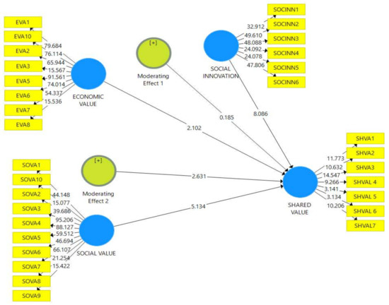 We adopted Chin’s [160] idea of hypothesis testing by resorting to a bootstrapping procedure as can be seen in Table 3, which shows that there is a significant relationship between social and economic values in shared value creation with correlation of 0.598 (i.e., 59.8%). Therefore, H1 is supported. The hypotheses concerning H2 and H3 of the constructs have a direct relationship with shared value and are all supported, thus indicating the importance of economic value (β = 0.274, t = 2.213, p = 0.027) and social value (β = 0.545, t = 5.425, p < 0.001) to shared value. H2, which depicts direct causality between economic value and shared value, showed a significant positive relationship with a moderate impact of 27.4% on shared value creation as shown in Table 4