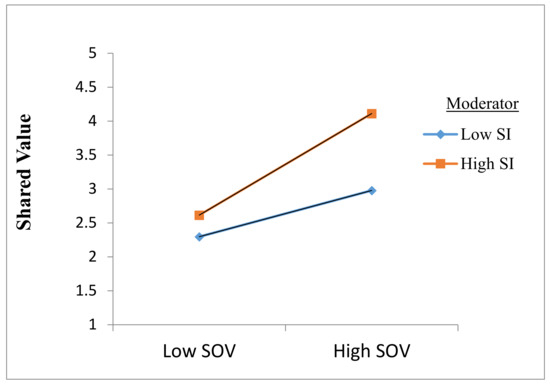 The moderation effect of social value on shared value by social innovation, SOV = social value.