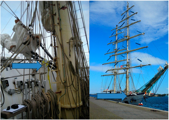 The measuring device was placed at the beak of the ship, and the base of the foremast (Figure 1), around 1.7 m over the deck. The chosen location minimized the effect of the ship’s own emissions on the measurement. All the exhausts, i.e., from the kitchen, power generator, or engine, were behind the sensors. The tall ship mostly sailed into the wind or with a side wind, therefore leaving the sensors freely perfused by air coming directly from the sea. Most of the cruise was on the sails, and the engine was used occasionally. The power generator and engine exhaust were emitted through a chimney located on the mainmast at the waist. The chimney’s height was 32 m from the deck level.