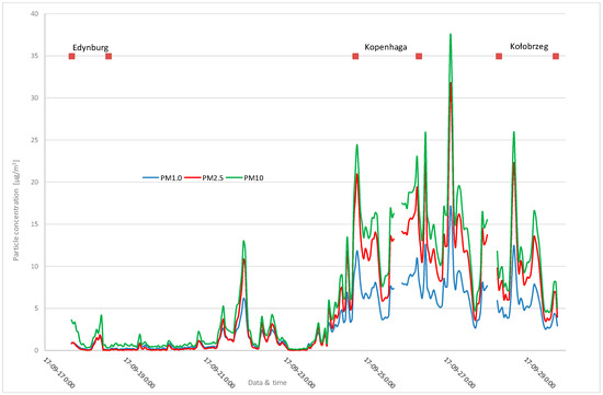 The cruise took place between 16 and 30 September 2017. It began in Edinburgh port in the UK and finished in Szczecin port, Poland. During the cruise, the tall ship stopped in two ports—Copenhagen (Denmark) and Kołobrzeg (Poland). The measurements began on 17 September at 16:00 and stopped on 29 September at 20:00. The tall ship set sail in Edinburgh at 14:00 on 18 September and began its cruise through the North Sea towards of the Danish straits. After sailing through Skagerrak and Kattegat, it sailed to Copenhagen at 17:30 on 24 September. It stayed in the port until 26 September 8:15. Next, through the Baltic Sea, it sailed to the Kołobrzeg port in Poland and reached it on 28 September at 8:00. It left the port on 29 September at 18:00 and sailed towards Szczecin. The measurement of particles concentration was stopped an hour after leaving the Kołobrzeg port. The average hourly concentration of PM10, PM2.5, and PM1 particles throughout the whole cruise and the change of the particle’s fraction quota are shown in Figure 2.