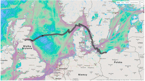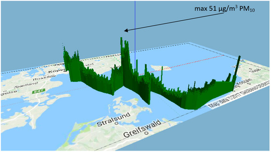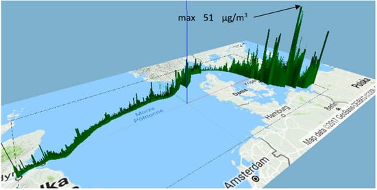 The second area of high concentrations can be spotted in the distance from 140 to 220 km from the land. The highest level of PM10 was about 38 μg/m3, 180 km from the land. The onshore sources of PM emission were replaced by the emissions arising from ships. This claim could be confirmed by the fact that such locations were spotted at a considerable distance from land—about 140–220 km, where the influence of land-based emissions sources is rather negligible. The location of areas with high PM10 concentrations indicates that the main source of emissions were probably ships with marine diesel engines (Figure 11). This thesis was confirmed in a detailed analysis of measurement data, presented in the following part of the article. The accumulation of pollutants from ships relatively close to the land is confirmed by the authors [27]—nearly 70% of ship emissions occur within 400 km of coastlines. It is causing air quality problems through the formation of ground-level ozone, sulphur dioxide emissions, and PM in coastal areas and ports with heavy traffic.