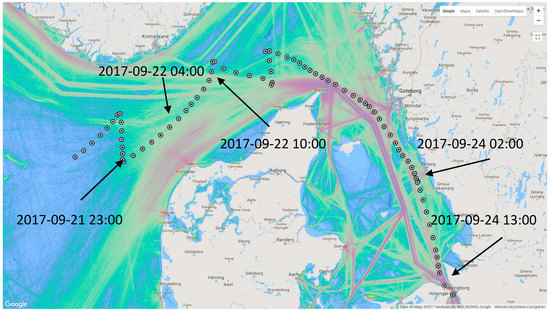 Around 23:00–24:00 on 21 September, an increase in concentration can be observed. Average PM10 and PM2.5 concentrations for this hour were 13 and 10 μg/m3, respectively. Shipping lane analysis, performed with the help of the marine traffic data, shows that the tall ship was close to the main lane travelled by numerous ships (to or from the Danish Strait)—Figure 5 and Figure 6. After crossing the lane, STS Fryderyk Chopin started to recede from the different ships; therefore, the pollution level decreased to about 1.5 μg/m3 of PM10. About 4:00 on 22 September, the ship was more or less in the middle of the strait between Norway and Denmark. The influence on PM concentration of other ships, or of the land, could not be seen because PM10 concentrations were close to 0 μg/m3.