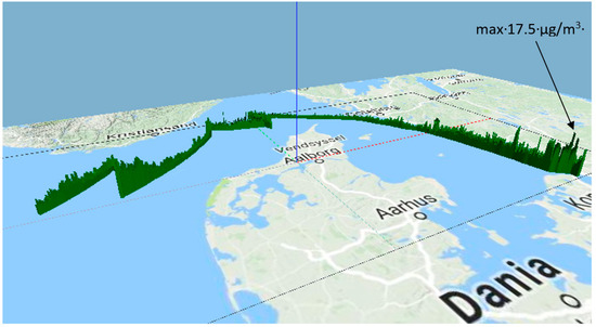 3D graph of temporary PM10 concentration (μg/m3) applied on the cruise path.