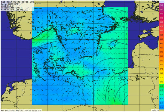 Figure 7. Forecast of wind strength and direction at 6:00 on 23 September 2017 based on the National Oceanic and Atmospheric Administration - Global Forecast System (NOAA-GTS) data from 12:00 on 22 September 2017.
