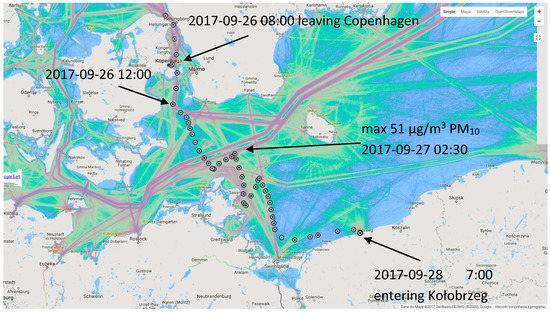 On 27 September at about 2:30, the maximum concentration of PM10 was noted during the whole cruise (Figure 8)—51 μg/m3 PM10 and 44 μg/m3 PM2.5. The tall ship was then 25 km from the nearest land, so much further than during the past hours or other cruise days. The average wind speed was around 6 m/s direction SE. The distance to the land in the direction of the blowing wind was over 180 km. It is in an area where the route leading from the Baltic Sea towards ports in northern Germany runs (Figure 8). A high level of pollution was sustained for around 2 h (hourly averages: 37 μg/m3 PM10 and 32 μg/m3 PM2.5). From vessel traffic data and observation of PM concentrations, it appears that emissions from ships are a key source of air pollution with particles in this region (Figure 8). The traffic density in this area is about 22 thousand routes per 0.02 km2 per year (source: marine traffic).