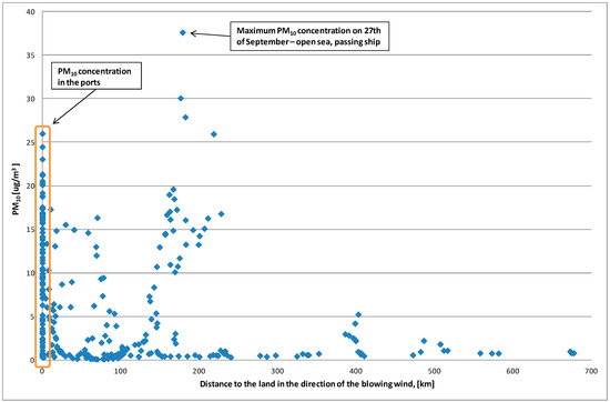 The undertaken measurements allow for an analysis of pollution migration. Figure 10 shows the dependence of the average 1 h PM10 concentration on the distance from land. The distance was calculated in the direction of the blowing wind. For example, if it was blowing from the east, the nearest land on the east was located and distance between ship and the land measured. In order to make the calculation precise, the wind circulation was also included. The analysis was based on weather data from NOAA-GTS forecast and notes from the cruise log shared by the captain of the tall ship. The GTS (Global Forecast System) is a global numerical weather prediction system supported by the American NOAA—National Oceanic and Atmospheric Administration. The weather data were downloaded from the NOAA-GTS server during the cruise and read in zyGrib tool. Sample data showing the strength, direction, and wind rotation are shown in the Figure 7. This information allowed for the determination of wind direction and its circulation in the region of the cruise. The wind speed during the cruise was between 2 and 14 m/s. The main aim of the analysis was to check if the recorded emission peaks can be caused by land sources. For example, maximum concentration of PM10 was noted on 27 September at 02:30 when the tall ship was 25 km from the nearest land (Germany). The distance to the land (Poland) in the direction of the blowing wind was over 180 km. The nearest air quality monitoring station in Poland is located in Koszalin (http://powietrze.wios.szczecin.pl/dane-pomiarowe/automatyczne/stacja/5/parametry/wszystkie). The recorded concentration of PM10 on 26 September at 19:00 (the average wind speed was 7 m/s so the distance of 180 km was defeated in about 7.5 h) was equal to 38.9 µg/m3. This example shows that increase of PM10 concentration was most likely caused by ship emission.