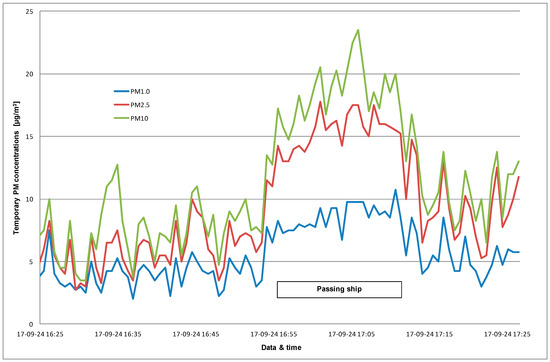 The influence of ships’ emissions was confirmed by detailed analysis of temporary PM concentrations and weather conditions. One of the increases was spotted a couple of kilometres from the centre of Copenhagen on 24 September 2017 between 16:25 and 17:25 (Figure 12). The tall ship was using its engine (the results do not show the influence of its own emission) and preparing to enter the port. The oil tanker, going in the same direction, was passing the tall ship between 16:55 and 17:15 from the east site (Figure 11). This situation is very clearly visible in the graph showing the change of particle concentration.