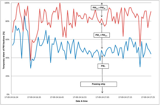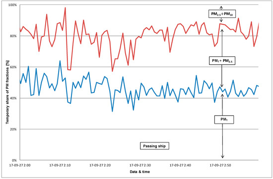 Also in this case, with the increase in concentrations, the share of PM fractions changed (Figure 16). Before the meeting, PM2.5 in PM10 was about 72%, while during passing and later—over 82%. Mainly the share of particles in the range PM2.5 ÷ PM10 increased from approximately 30% to 38%. The increase in the PM concentrations caused by the passing ship was about 28 μg/m3 for PM10 and 25 μg/m3 for PM2.5. After passing, the concentrations slightly decreased, but were still higher than before. This can be caused by the manoeuvre, during which the position of the ship is not changing a lot, only its direction. The wind direction ESE was appropriate to allow the migration of pollutants from near the located shipping lane. As it moves away from it, the concentration of particles was decreasing (Figure 15).