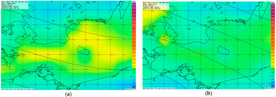 Forecast of wind strength and direction at 18:00 on 24 September 2017 (a) and at 00:00 on 27 September 2017 (b) based on NOAA-GTS data from 12:00 on 22 September 2017.
