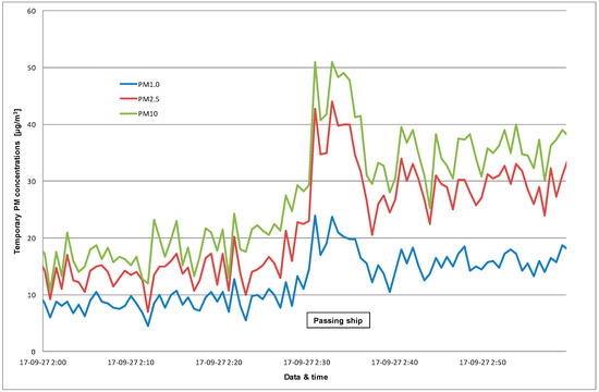 Before the maneuver, the average concentrations were about 18 μg/m3 (PM10) and 13 μg/m3 (PM2.5). Passing of ship at 02:30, lasting about 6 min, caused a short-term increase in concentrations to approximately 46 μg/m3 (PM10) and 38 μg/m3 (PM2.5)—Figure 15. The time of concentration increase was shorter than in the first case, because the tall ship was changing sailing direction and not moving in the same direction as the passing ship. The value of PM10 equal to 51 μg/m3 was the highest during the whole two-week cruise.