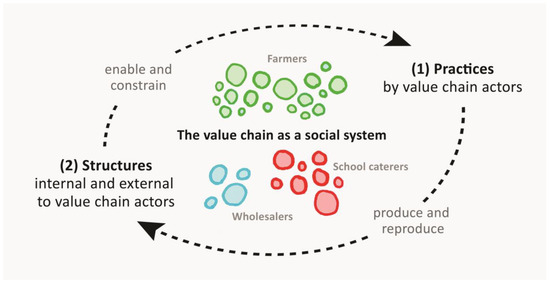 The present study applies a structuration theory approach that investigates the value chain as a social system. The system includes actors at different levels of the value chain, such as farmers, wholesalers, and school caterers, as well as structural factors and practices within the value chain (Figure 1). It describes how practices by value chain actors (1) shape the structures within the system of the value chain while the structures (2) enable and constrain these same practices.