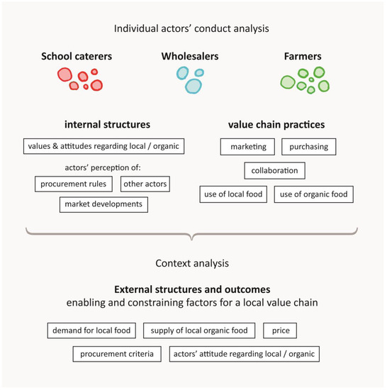 In order to broaden the understanding of the value chain as a complex system of actors and value chain practices, the present study uses the four analytical components of strong structuration theory (practices, internal structures, external structures, and outcomes). The study also follows Stones’ [11] iterative analysis process to explore each actor’s value chain activities and their individual perspectives, values and attitudes (actors’ conduct analysis). Enabling and constraining factors were derived (context analysis) on this basis.